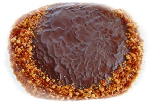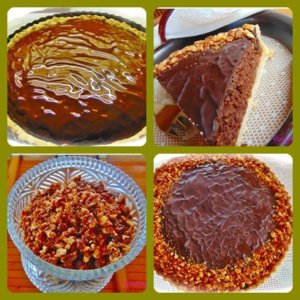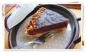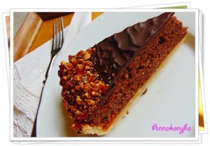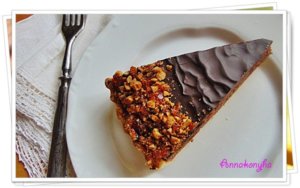 Amikor a sütemény teljesen kihűlt, az olajjal együtt felolvasztott csokoládéval bevontam, majd lehűtöttem. Mielőtt megdermedt volna, hideg levegőt fújó hajszárítóval a tetejét hullámosra fújattam. A pite szélét mogyoró krokanttal díszítettem.