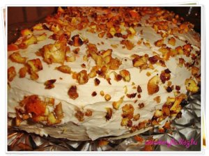 A kettévágott tészta alsó lapját megkenem a krém felével, ráteszem a fedőlapot és a maradék krémmel kívülről is bevonom,elsimítom. A cukrozott narancshéjjal a külső felületét beszórom.