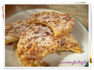 Tetejét bekenem egy ecset segítségével a tojásfehérjével, tetejét beszórom a cukrozott dióval és 180 °C-on aranyszínűre sütöm. Porcukrot szórok rá.