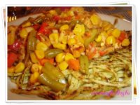 Hozzávalók. 1 + 1 fej vöröshagyma, 2 +2 ek olaj, 60 dkg mellfilé, só, 1 kk piros paprika, bors, kakukkfű, borsikafű, 3 db zöld paprika, 3 db paradicsom, 1+1 dl száraz fehérbor, 2 db sárgarépa apró kockákra vágva, 30 dkg főtt kukorica, 30 dkg friss zöldbab, (vagy fagyasztott ) 30 dkg spagetti tészta, 4…