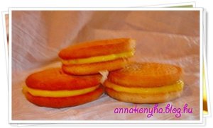 A tésztaformákat sütőpapírral bélelt tepsibe rakom, és 180 °C-ra előmelegített sütőben 15 perc alatt megsütöm. Kihűlés után egy kiskanál citromkrémet teszek az egyik tésztakorong közepére, ráhelyezem egy másik korongot és enyhe nyomással a krémet a lapok széléig nyomom. Hűvös helyen tárolom.