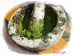 A bazsalikomot, a mentát, a rozmaringot, a kakukkfűvet és a zsályát a fokhagymával , és az olivaolajjal együtt a fűszer-mozsárba teszem , és pépesre őrlöm, majd hozzákeverem a citromot is.