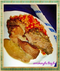 Összeforgatom a forró bulgurral, olivaolajjal meglocsolom, és a felszeletelt bárányhússal tálalom. Mártást kínálok hozzá.