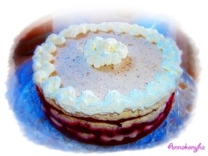 Másnap kemény habbá vertem a díszítésre szánt tejszínhabot a habfixálóval, és egy habzsákból nyomott habrózsákkal és pár szem meggyel díszítettem a torta tetejét.