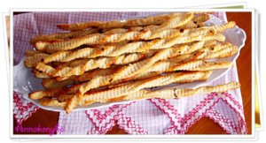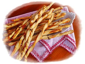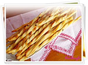 Lisztezett felületen kb 5 mm vastagra nyújtom a tésztát, Felvert tojással megkenem, rászórom az aprított aszalt paradicsomot és egy kevés tengeri sót. A tésztát kb 1,5 cm-es csíkokra vágom. Két végét megfogva párat tekerek rajta, és sütőpapírral bélelt tepsibe teszem a rudakat.