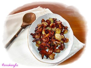 A megtisztított gombát felszeletelem. A megmaradt olivaolajat felhevítem, és a gombát megpirítom. Rádobom a felaprított fokhagymát, megsózom, és hozzáforgatom a félretett karamellizált hagymát. Fűszerezem a kakukkfű leveleivel, egy kevés Caynneborssal és borecettel.