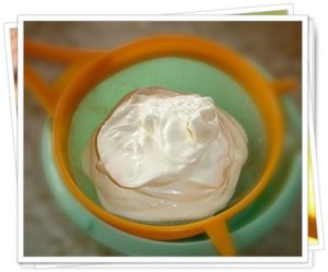 Egy műanyag szűrőkanálba keverés nélkül kiöntöm a joghurtot. Egy akkora tálba illesztem, amire pontosan ráilleszkedik, és az alját nem éri el. Egy kis tányért vagy egy kis fedőt teszek a tetejére. A hűtőbe teszem. Kb 2 napig hagyom csöpögni, közben a savót mindig leöntöm. Amikor már száraz marad a tál, nem csöpög ki több savó,—a krémsajt elkészült! 🙂