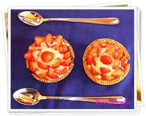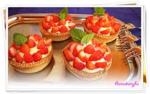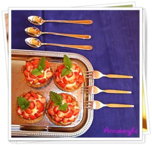Az elkészült krémet a kis kosarakba kanalazom, a megmosott és felszeletelt epret rárakom, és kicsit bele is nyomkodom.