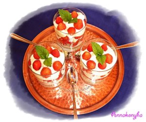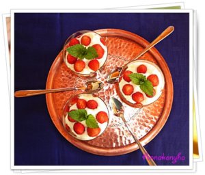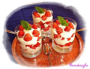 Az előkészített poharakba a krémet, és a felszeletelt epret rétegezve lerakom. Krémmel kezdem, és a legszebb szemekkel díszítve fejezem be.