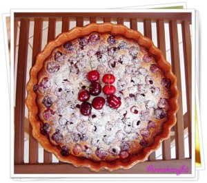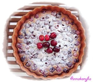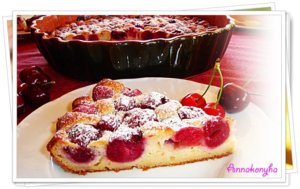Egy 24 cm-es piteformát kivajazok, és a masszát belesimítom. A kimagozott cseresznyéket 2 ek lisztbe megforgatom, majd a tésztába nyomkodom.