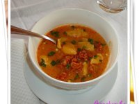 Hozzávalók: 1/2 kg burgonya, 2 szál sárgarépa, 1 kisebb fej vöröshagyma, 2 ek. étolaj, só, bors, 1 tk őrölt pirospaprika, 1 csokor tárkony, 10-15 dkg füstölt kolbász, 1 tojássárgája, 1-2 ek. liszt, 1 ek tejföl. Elkészítése: A zöldségeket megtisztítom, felaprítom, és 2 ek. olajban pár percig párolom. Őrölt paprikával megszórom, és miután elkeverem, azonnal felöntöm…