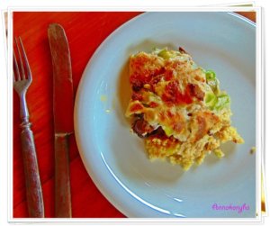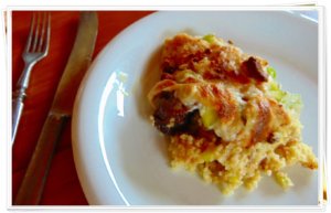 Egy tepsit kiolajozok, az aljába egyenletesen elterítem a főtt kölest,rászórom a hagymás sült húst, majd beterítem a cukkini karikákkal.
