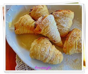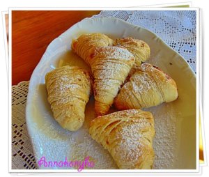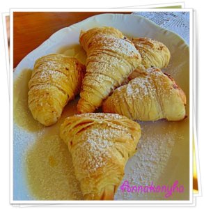 A lehűtött tésztahengert felszeletelem 1-2 cm-es tekercsekre, a közepét az ujjammal kinyomom, így egy szerzetes csuklyára emlékeztető formát kapok, amit a túrós krémmel megtöltök, majd a sütőfóliával bélelt tepsire rakom.