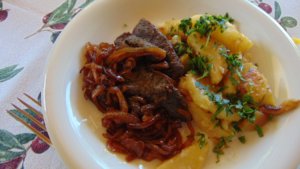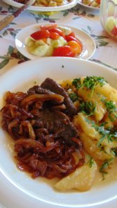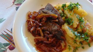 Közben elkészítem a hagymát. A lila hagymát kb 1/2 cm vastagra felkarikázom. Az olívaolajat a vajjal együtt felforrósítom. Beleszórok 1 ek nádcukrot és kevergetve karamellizálom. Amikor megolvadt a cukor, rádobom a felszeletelt vöröshagyma karikákat. Tartalékra veszem a lángot, és kb 20-25 percig kevergetve pirítom, majd ráöntöm a vörösborecetet. Még kb 5 percig hagyom karamellizálódni a borban lévő cukrot is.