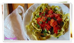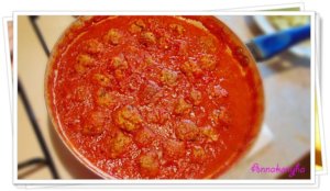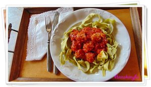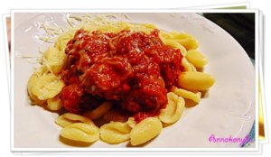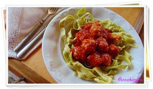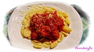 A paradicsomokat forró vízbe dobom, majd pár másodperc után szűrőkanállal kiemelem, a héját lehúzom, majd felkockázom. Hozzáadom a párolt zöldségekhez, sózom, borsozom, oregánóval fűszerezem. Együtt összeforralom, majd belerakom az elősütött húsgombócokat is. Takarék lángon, lefedve, időnként a serpenyőt megrázogatva puhára főzöm. Közben al dentéra kifőzöm az előkészített tésztát, és ha jól időzítek, azonnal tálalhatok.