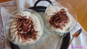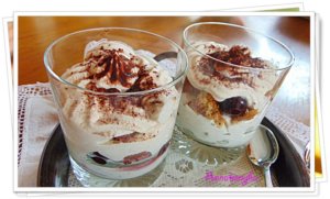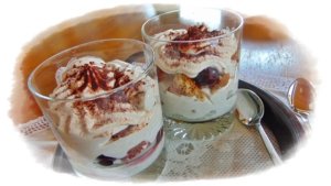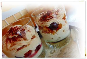 A poharak aljába teszek kb 2 ek gesztenyés krémet, és egy fél darab likőrbe megforgatott mézes puszedlit rátördelek. Rádobok 3 db rumos meggyet, és újra kezdem a rétegzést : krém-puszedli-meggy. A maradék krémet habzsákba teszem, és a legtetejére rózsákat nyomok. Kakaóporral meghintem, és tálalásig a hűtőbe teszem pár órára.