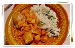 A serpenyőben maradt zsiradékon megpirítom az apróra felvágott vöröshagymát és a fokhagymát, majd hozzáöntöm a paradicsompürét, és tovább pirítom. Felöntöm 2 dl száraz fehérborral, pár percig kis lángon lassan forralom, majd vékonyra felszeletelt kelkáposzta leveleket beleteszem, összemelegítem. Visszarakom az elősütött csirkecombokat, és lefedve tovább párolom, a szaftot besűrítem. Közben ízesítem sóval, borssal, majoránnával. Ha kell, paradicsomlével pótolom a folyadékot . A legvégén hozzáteszem a virslikarikákat, és egyet forralok rajta.