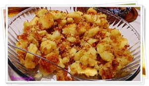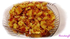 Ha a burgonya megfőtt, vizében hagyva összetöröm, és hozzáadom a lisztet, és a megpirított vöröshagymát. A hőfokot közepesre veszem, és addig keverem, amíg teljesen összeáll, az edény falától elválik, és több lisztet már nem vesz fel. Akkor félreteszem, és egy serpenyőbe 2 ek olajat felforrósítok, és a burgonyás masszából galuskákat szaggatok a forró olajba, és erős lángon aranybarnára pirítom. Érdemes több lépésben kisebb adagokat kiszaggatni, mert könnyebben meg lehet pirítani. Sütés közben az olajat pótolni kell.