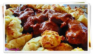 Ha a burgonya megfőtt, vizében hagyva összetöröm, és hozzáadom a lisztet, és a megpirított vöröshagymát. A hőfokot közepesre veszem, és addig keverem, amíg teljesen összeáll, az edény falától elválik, és több lisztet már nem vesz fel. Akkor félreteszem, és egy lapos tepsibe 2 ek olajat öntök, és szétkenem. A burgonyás masszából galuskákat szaggatok a beolajozott tepsibe, olajjal vékonyan lekenem a tetejüket, és grillező programon aranybarnára pirítom.
