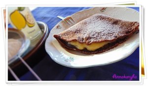 A palacsintatésztához egy tálban összekeverem a lisztet, a sütőport, a kakaót,a cukrot, a sót. Az olvasztott vajat kikeverem a tojásokkal és a langyos tejjel, majd apránként összehabarom a lisztes keverékkel. Kézi habverővel teljesen csomómentesre keverem. Fél órára hűvös helyre teszem.