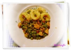Lobogva forró, sós vízben , 5 perc alatt kifőzöm. Lapáttal egy vékonyan kiolajozott serpenyőbe kiszedem, összerázogatom, hogy ne ragadjanak össze, és melegen tartom.