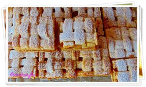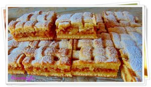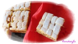 A tésztát ketté osztom. Egyik felét tepsi méretűre kisodrom, majd a tepsibe illesztem. Zsemlemorzsával vékonyan megszórom, majd az almatölteléket rásimítom, a másik kinyújtott tésztát derelyevágóval 1-1,5 cm vékony csíkokra vágom, és kosárfonat szerűen berácsozom. 180°C-on, 40-50 alatt szép aranybarnára sütöm. A tepsiben hagyom kihűlni, majd porcukorral beszórom, négyzetes szeletekre vágom, és már tálalhatom is.