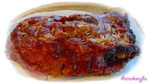 A kacsát a sütőtálba helyezem, a hátára fektetve, és kb. 1 dl vizet öntök alá. A sütőt felmelegítem 200 °C-ra.