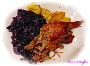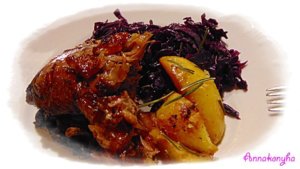 Párolt lila káposztával és a ropogósra sült burgonyával tálalom.