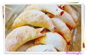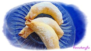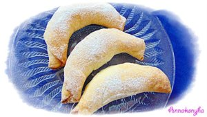 Lisztezett felületen ovális vékony lapokat sodrok belőlük, majd 1-1 evőkanálnyi tölteléket teszek a közepére, és kifli formára feltekerem őket.