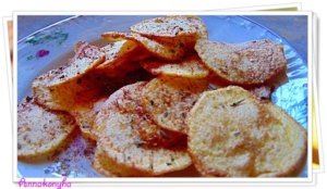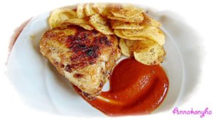 Fűszeres burgonya chipsszel és ketchuppal tálalom.