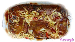 A hússzeleteket a szalonna zsírjában, erős lángon hirtelen elősütöm, majd a sütőtálba egymás mellé rakom. A maradék zsiradékot a hússzeletek alá öntöm.