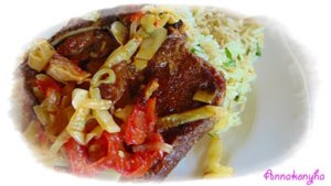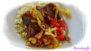 A hagymát , a paprikát, és a paradicsomot felkarikázom, és a tarjaszeletekre halmozom. Enyhén megsózom, a fokhagyma gerezdeket rászórom, meglocsolom a fehérborral, majd fóliával lefedem, és 170 °C-on, 2-2,5 óra alatt puhára párolom.