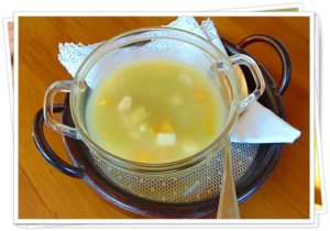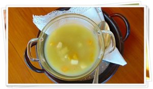 A megtisztított gyümölcsök héját és a magokat eltávolítom, majd apró kockákra szeletelem. Az összes gyümölcs 2/3-át annyi vízben ami éppen ellepi, felteszem főni. Egyet forralok rajta, majd turmixba krémesre keverem. Visszateszem a tűzre, közben cukorral ízlés szerint édesítem. 2-3 db szegfűszeget dobok bele, majd a tejszínnel kikevert pudingporral enyhén besűrítem a levest. Forrásig hevítem, majd beleteszem a félretett, felaprított gyümölcsöt.