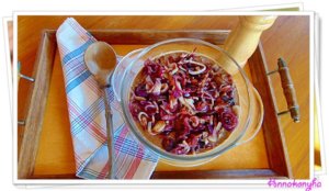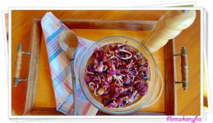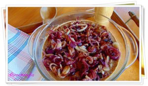 Egy száraz, forró serpenyőben, 1 ek olajon elkezdem párolni a maradék hagymát. Amikor sisteregni kezd lejjebb veszem a lángot, megszórom a nádcukorral, és 2-3 percig kevergetem, majd takarékra veszem a lángot, és fél óráig kevergetve karamellizálom. Végül ráöntöm a balzsamecetet, és még pár percig hagyom karamellizálódni a balzsamecetben lévő cukrokat is.