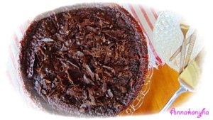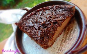 Az elősütött kekszalapra öntöm a krémet, rászórom a felaprított étcsokoládét, és 140 °C-os sütőben, kb 50-55 perc alatt lágyan remegősre sütöm.
