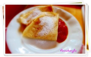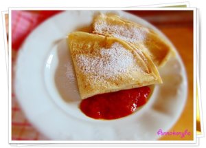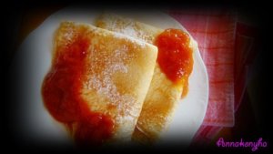 A málna dzsemet egy kevés vízzel hígítom, mikróban pár másodperc alatt felmelegítem, majd a betöltött palacsintákra öntöm.