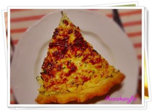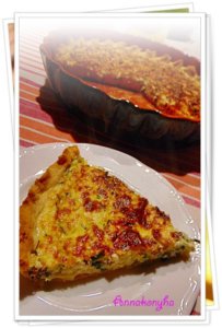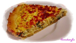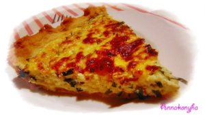 Ezt a tejszínes masszát ráöntöm az előkészített tésztára. A tálat enyhén megütögetve a tölteléket elegyengetem, majd 200 °C-os sütőben, kb 30 perc alatt aranybarnára sütöm. Néhány percig pihentetem, majd még melegen szeletelem és tálalom.