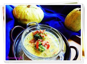 A sült tököt a tejszínnel együtt pürésítem, majd hozzáadom a leveshez, és besűrítem vele. Egyet forralok rajta, majd ízesítem a csilikrémmel és a citromlével. A tetejére szórom a kisütött bacont és azonnal tálalom