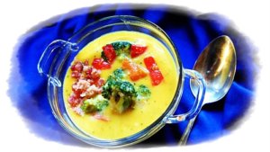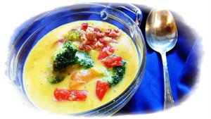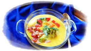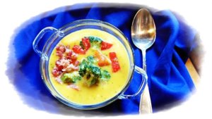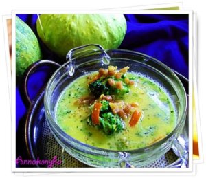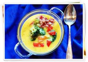 A rózsáira szedett brokkolit és a kicsumázott, felkockázott paprikát egy kevés olívaolajon átpirítom a zúzott fokhagymával és a curry fűszerkeverékkel együtt. Felöntöm 1 liter vízzel, sózom, borsozom. Összeforralom és főzöm kb 10 percet.