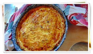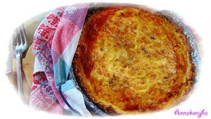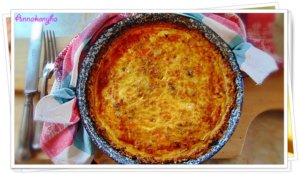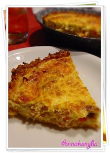 Közben egy serpenyőben kevés olajon megpirítom a felkockázott szalonnát, majd rádobom a felkarikázott hagymát, és az apróra felkockázott paprikákat. Kevergetve átpirítom a zöldségeket, majd elegyengetem az elősütött quiche alapon.
