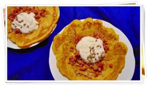 A serpenyőben maradt zsiradékon sütöm ki a palacsintákat. Egy adagot a palacsintasütő közepére kanalazok, majd a kanál hátával kerekre igazítom. Mindkét oldalát aranybarnára sütöm. Ugyanígy elkészítem a többit is.