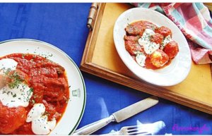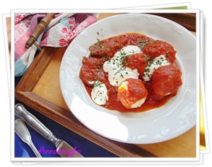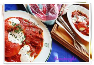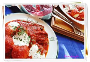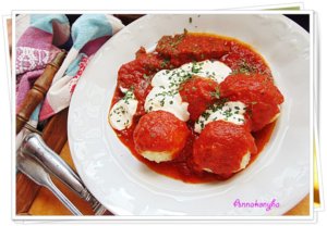 A burgonyát héjában megfőzöm, megtisztítom, még forrón áttöröm, majd hűlni hagyom. Hozzáadom a többi belevalót, majd gyorsan összeállítom. Közepes méretű gombócokat formázok belőle, majd gyöngyöző, sós vízben kifőzöm. Ha feljött a víz tetejére, további 2 percig főzöm, majd szűrőlapáttal kiemelem, tálra rakom, és leöntöm a forró paradicsomos mártással. Melléhelyezem a szívet, majd sok tejföllel és aprított petrezselyemlevéllel tálalom.