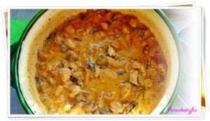 Hozzáadom a hagymákat és a gombát, és tovább pirítom 5-10 percig. Ízesítem a kakukkfű levelekkel, majd felöntöm a fehérborral, és addig főzöm, amíg a folyadék el nem párolog. Hozzáöntöm az alaplevet és tovább forralom még 10 percig.