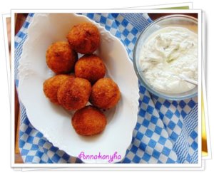 A mártogatóshoz összekeverem a joghurtot a majonézzel, majd belekeverem az áttört fokhagymát és a lereszelt uborkát. Ízesítem sóval és citromlével. Ezzel tálalom a rántott rizsgolyókat.