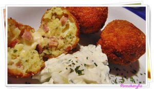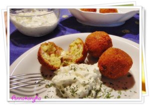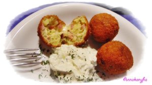 A rizottót elkeverem 1 tojással és a lereszelt sajttal. A masszából 8-10 gombócot formázok, a közepébe teszem a kis sajt kockákat. Meghempergetem a lisztbe, majd a megmaradt, felvert tojásba, végül a zsemlemorzsába.