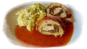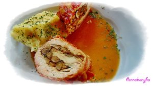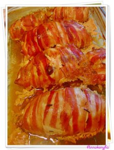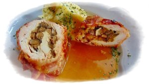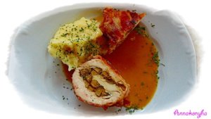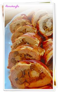 A csirkeszeletekre simítom a tölteléket, majd feltekerem. A bacon szeletekkel körbetekerem a hústekercseket. Kizsírozott sütőtálba rendezem, fehérbort öntök alá, lefedem és 180°C-on puhára párolom. A tetejét leveszem, és aranybarnára pirítom. Vágódeszkára teszem, fóliával letakarom, pihentetem mielőtt felszeletelem.