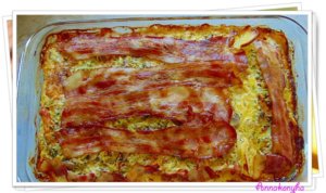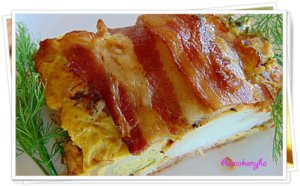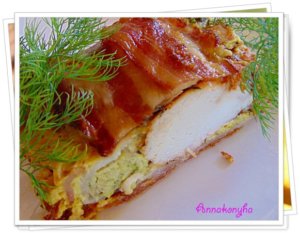 Egy fedeles sütőtálat vékonyan kiolajazok, és meghintem zsemlemorzsával, majd kibélelem baconnel úgy, hogy fedjék egymást a szeletek. Ezután beleborítom a cukkinis massza felét. Sorban a tetejére rakom az elősütött csirkemellet, majd betakarom a maradék cukkinivel. Végül a tetejére is bacon szeleteket fektetek és lefedem.
