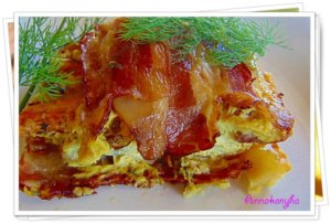 200 fokos sütőbe teszem, és alsó-felső sütésen kb. 40 percig sütjük. Ezután leveszem a tetejét, és további 10-15 perc alatt készre sütöm.