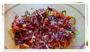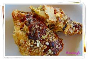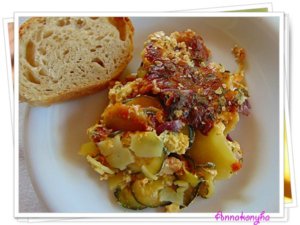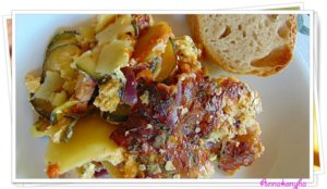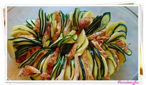 Egy sütőformát 1 ek olajjal vékonyan kikenek, 1 ek zabpehellyel beszórok. Váltakozva, tetőcserépszerűen, körkörösen elrendezem a cukkini- és a burgonyakarikákat.