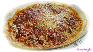 A joghurtot kikeverem a tojásokkal, hozzáadom a reszelt sajtot, majd sózom, borsozom, fűszerezem a kakukkfűvel, a felaprított petrezselyemmel és a kaporral. Ezt a joghurtos keveréket a cukkini rakottas tetejére öntöm és 1 ek zabpehellyel megszórom.